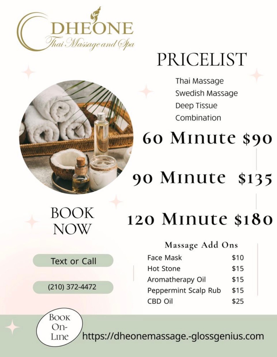DHEONE THAI MASSAGE AND SPA, is combination of Thai Massage with Western style Massage. Service include, Sweedish, Deep Tissue, Ashitsu , Hot stone and Thai Massage.